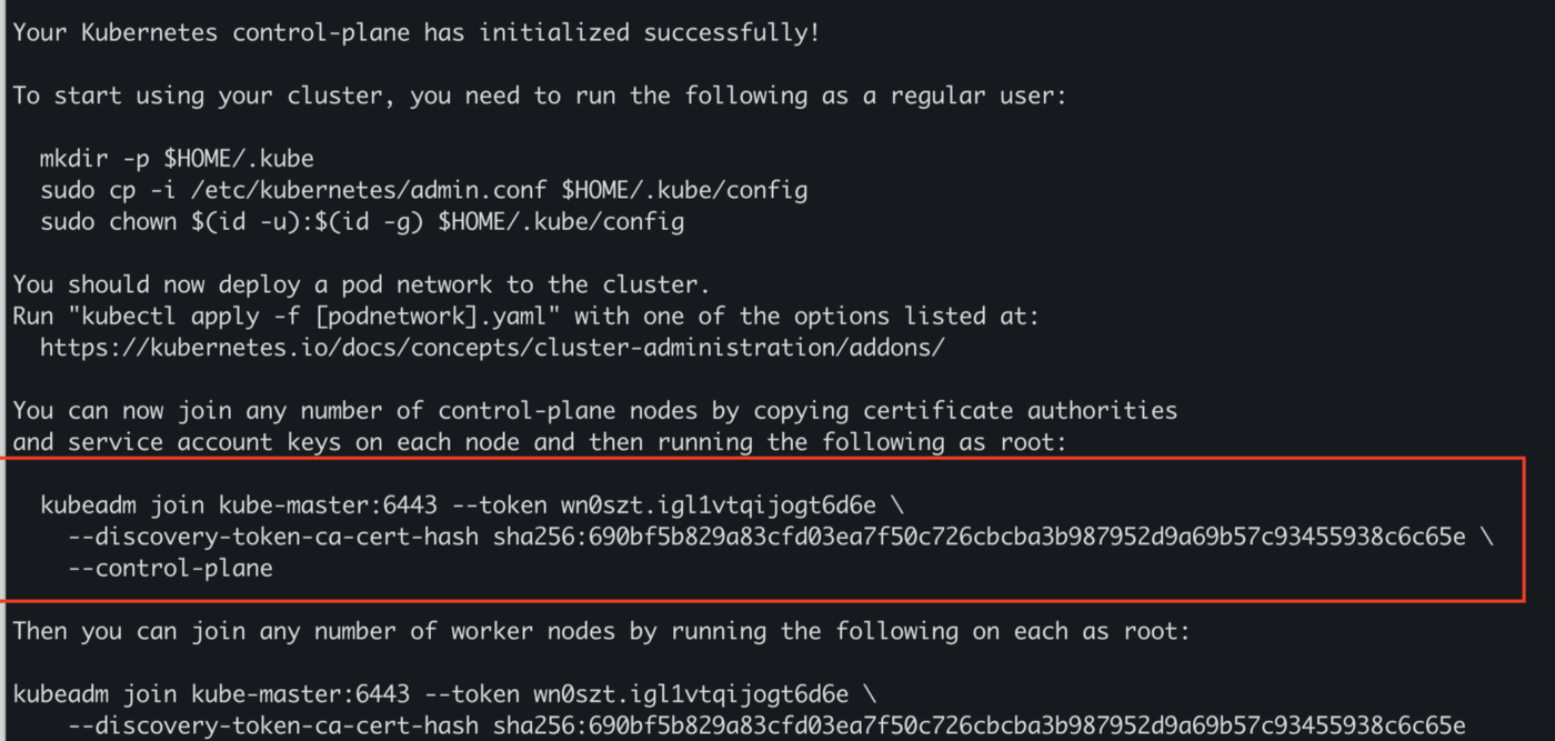 mkdir -p $HOME/.kube sudo cp -i /etc/kubernetes/admin.conf $HOME/.kube/config sudo chown $(id -u):$(id -g) $HOME/.kube/config