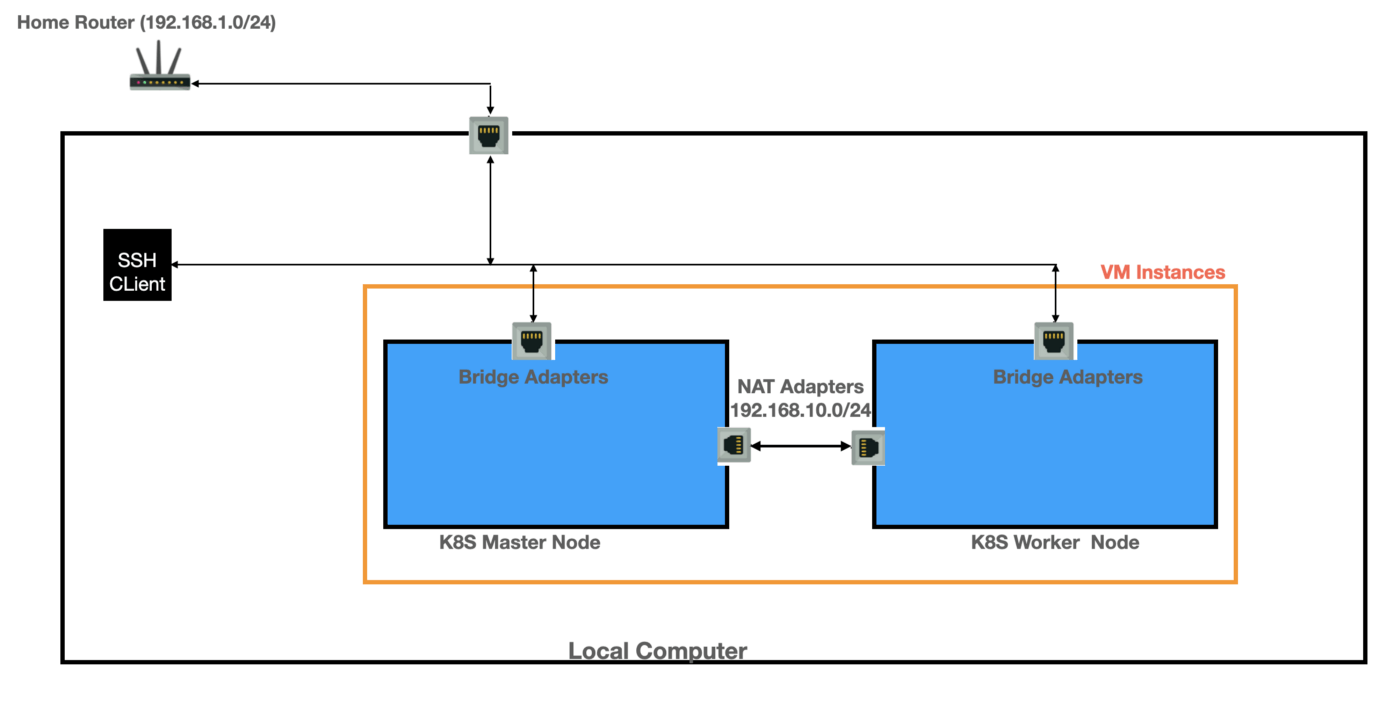 So this is what we are going to do. We will be creating multi-cluster VM instances of one Master and worker node. These VM instances will have the OS of Ubuntu 20.4, and each of these VM instances will have two network interfaces, one Bridge adapter, and another NAT Adapter. With Bridge adapter, the VM will be in the same network as the router network, and it will enable me to ssh VM instance and no need to login to the console of these VM instances. The NAT adapter, which will be assigned in a separate subnet, is how the Master and Worker node will communicate. Also, with NAT adapter, VM instances will access the external network, but no direct access to VM is possible. The CIDR range provided to the NAT adapters ( 192.168.10.0/24) differs from the Home router Network ( 192.168.1.0/24), so there won’t be any conflict.