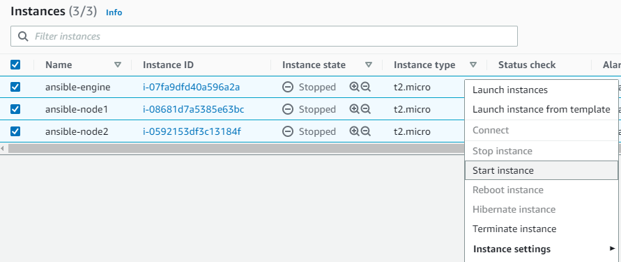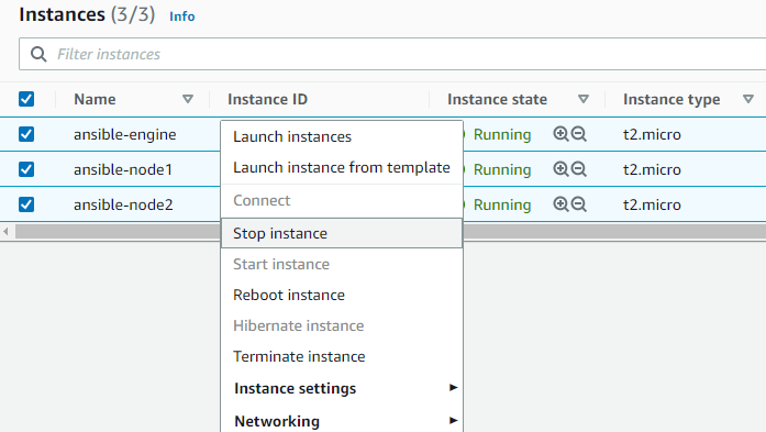 We will use instance private IP to access the ansible-nodes as the private IP will not change during instance lifetime. (Public IP will change when you Power off the instance as we will power off when we are not using the instances)