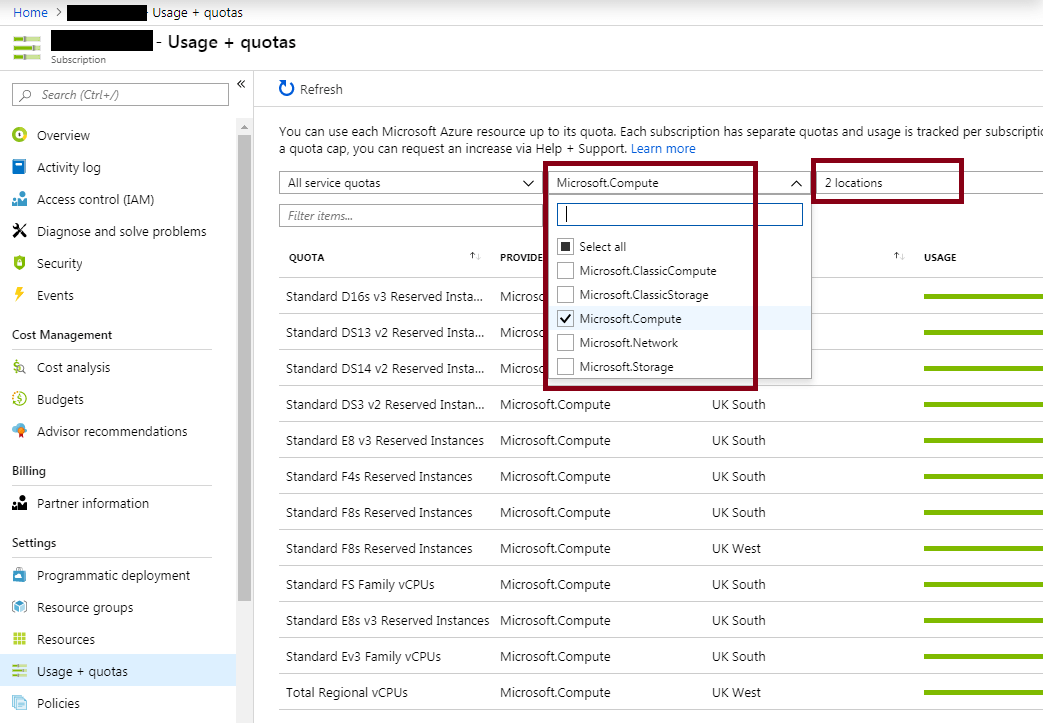 It will show current Usage and Limit of each resources items in all locations, as show below. Now filter out the resource type you want to see and update quota. Add more filters like Locations etc and see what is the usage and limit for your resources.