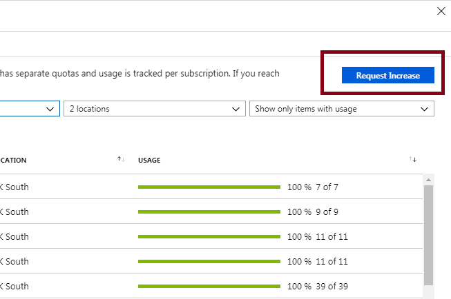 Let’s say you want to increase the quota limit for FS Series and FSV2 Series CPU’s in UK South (Europe) region, we can request the same. Find Request Increase button on upper right corner of the window as show below.