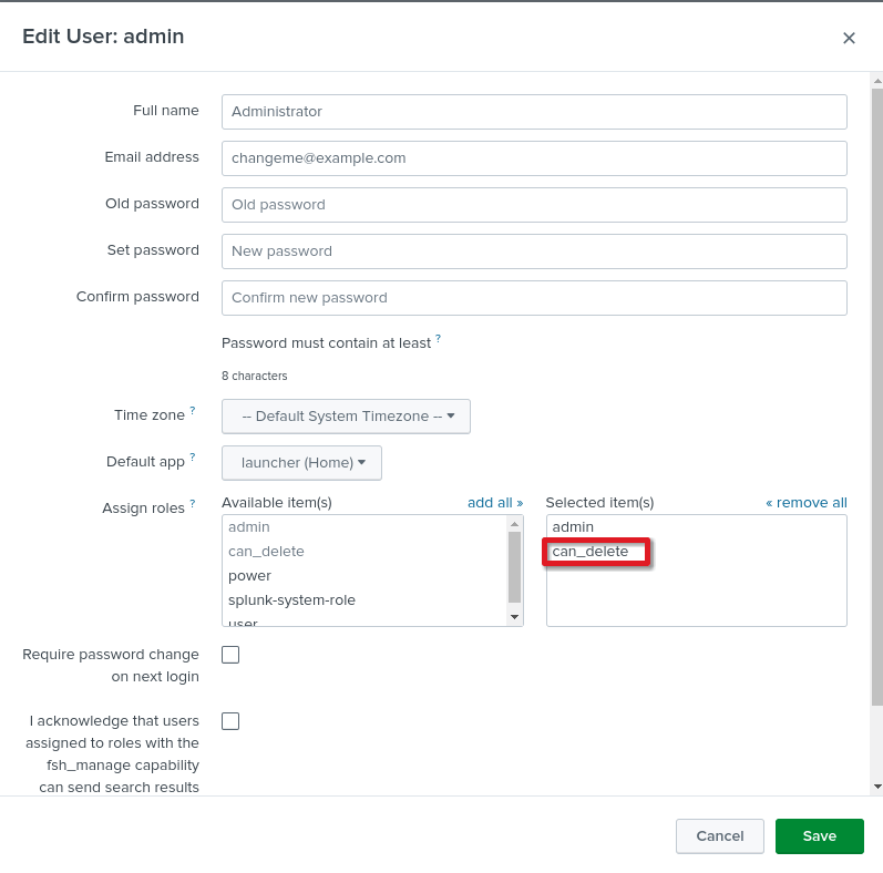 The ansible controller will be sending a lot of events and you may want to housekeep your Splunk server accordingly. In my lab environment, I will delete the old events but I need to allow the user with can_delete permission as even the admin user doesn’t have that permission.
