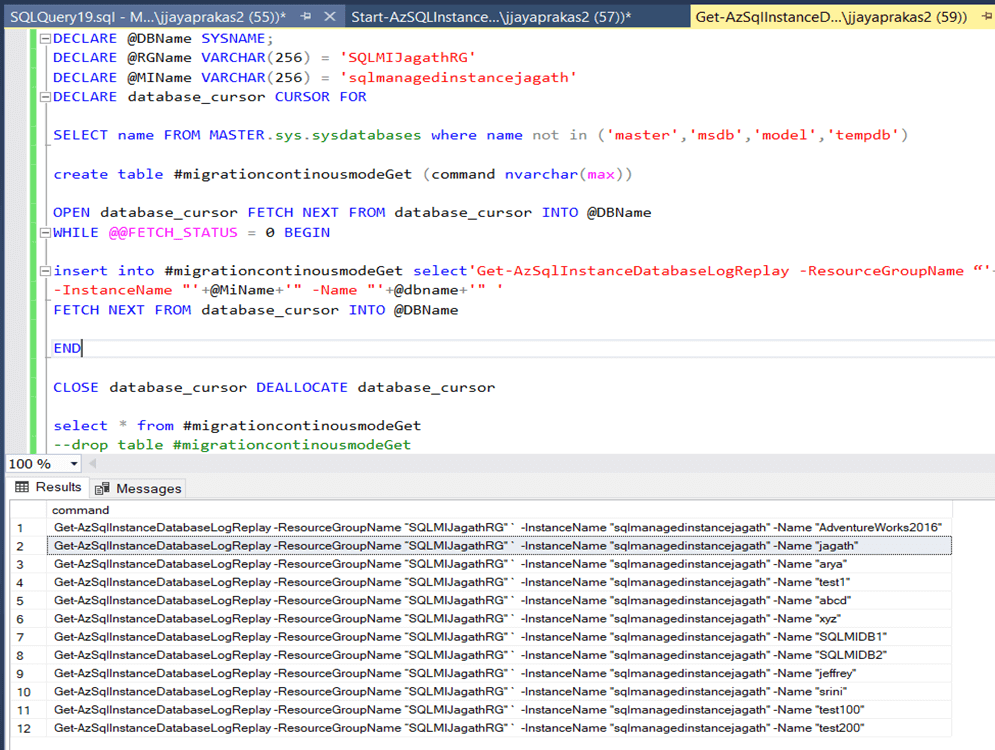 insert into #migrationcontinousmodeGet select'Get-AzSqlInstanceDatabaseLogReplay -ResourceGroupName “'+@RgName+'" `