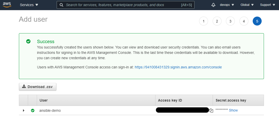 Remember to use the correct profile name in your terraform script main.tf later; eg: ansible in our case.